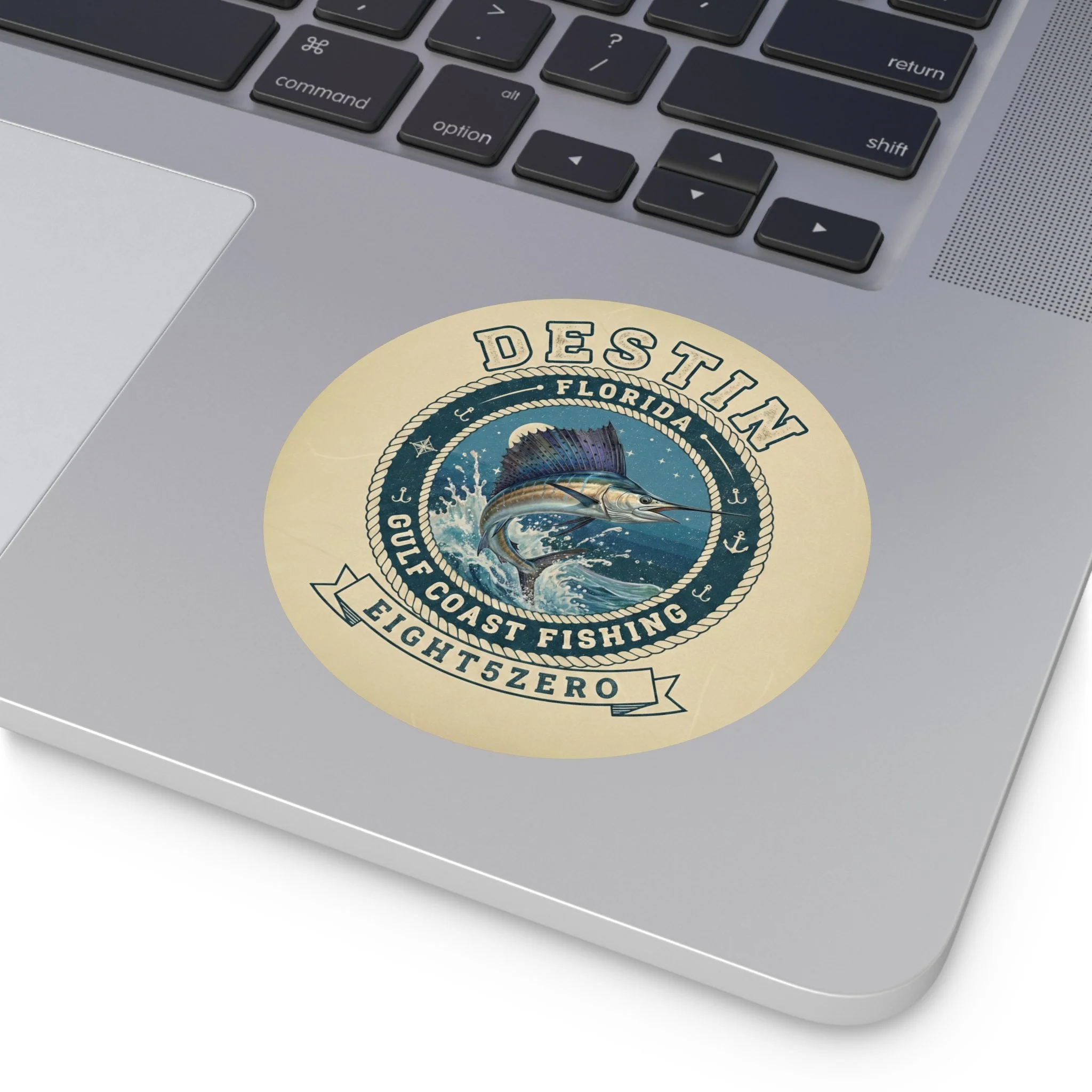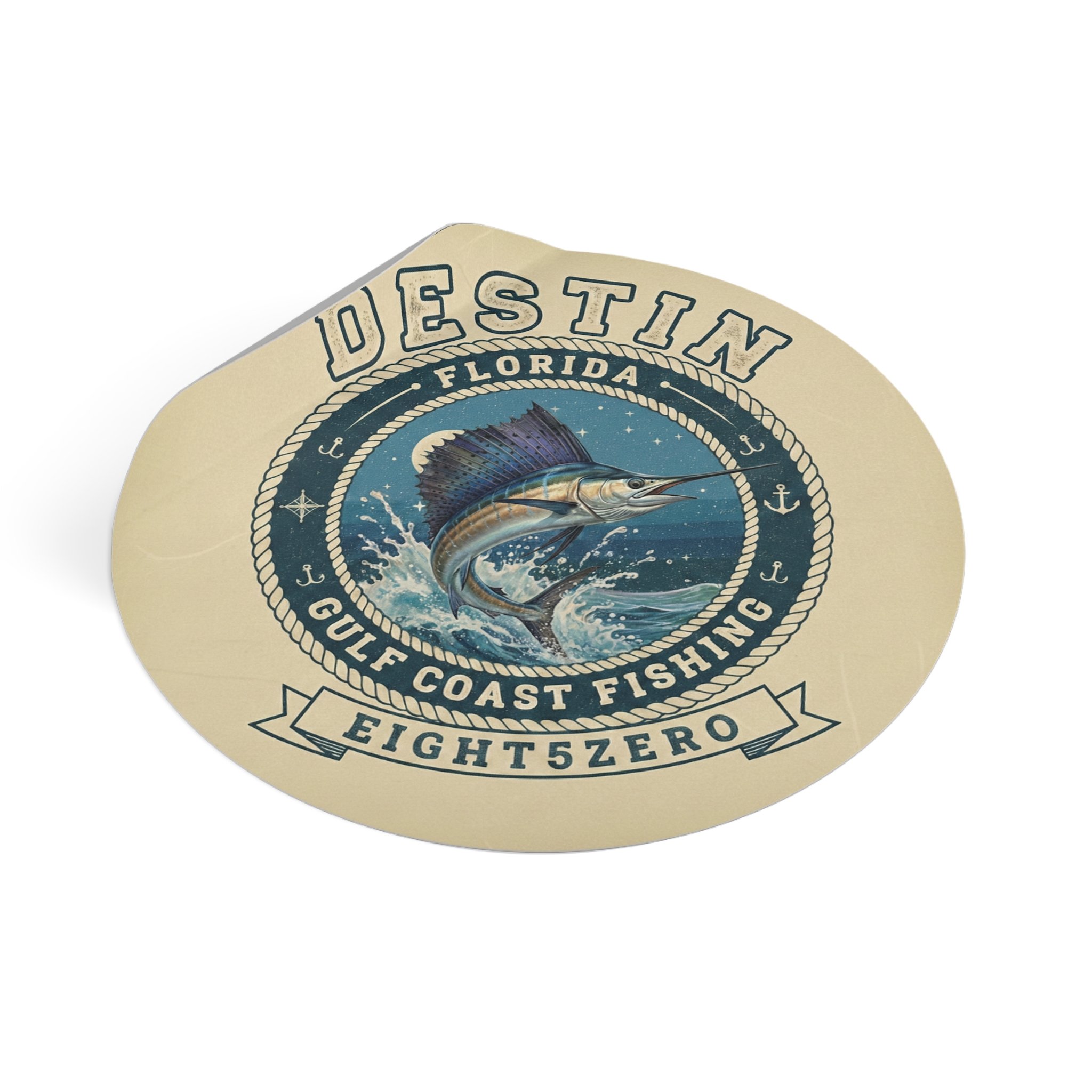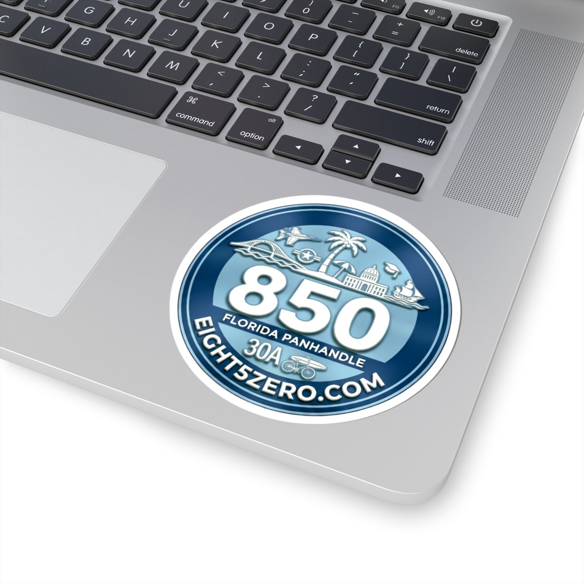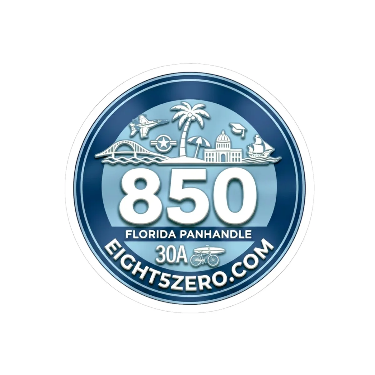 A glossy kiss-cut vinyl sticker celebrating the 850 Florida Panhandle lifestyle. Deep ocean blues and pearlescent highlights bring the 850 emblem and coastal icons to life — palm trees, beaches, bridges and small-town skyline — with a clean circular badge layout. The sticker adheres smoothly to laptops, journals, water-resistant surfaces and windshields, and reads clearly from a short distance, making it a subtle way to mark your gear or promote a local site or brand. The finish is bright and scratch-resistant, and you can choose white or transparent backing and multiple sizes to suit where you want to place it.